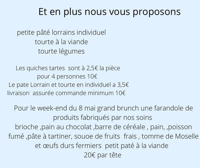 Vous y trouverez viennoiseries - pains - pâtisseries - pâtés lorrains - galettes de pommes de terre - sauce tomate- pâte à tartiner ...